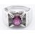 A hallmarked 9ct white gold ring being set with a round cut garnet to the head in a four prong design with engraved geometric borders. Hallmarked Birmingham 2006. Weight 5.9g. Size O. Stone measures 7mm diameter.