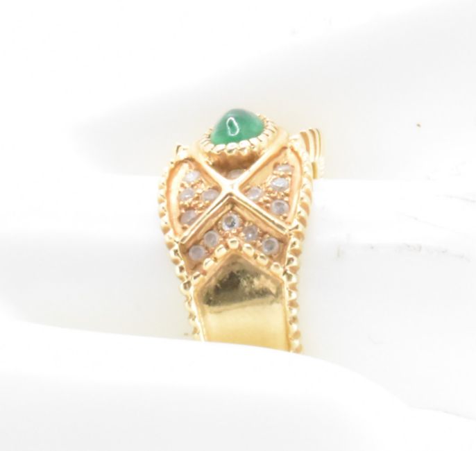An 18ct gold emerald and diamond ring. The ring having an oval emerald cabochon with 28 round cut diamonds set to the head. Marked 750. Weight 8.3g. Size P. Emerald measures 4.2 x 6 x 2.9mm.