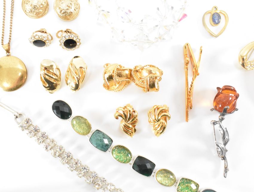 A collection of vintage costume jewellery to include a vintage 9ct gold cased wrist watch (interior of the case marked 375, weight 12.1g), a gold plated locket, a pair of gentleman's rolled gold cufflinks and collar studs, a Scottish clan brooch, simulated pearl necklace, necklace chains, brooches and bracelets.