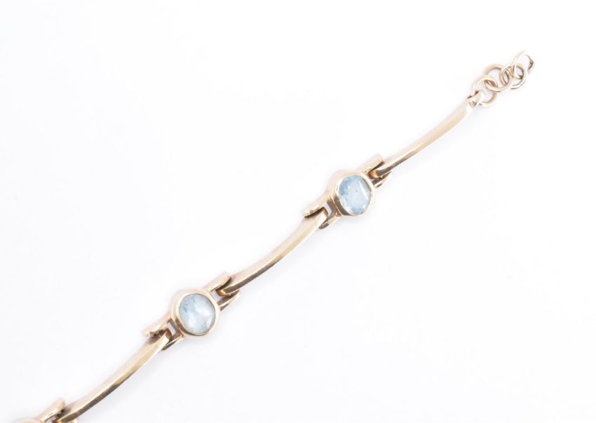A 9ct gold and aquamarine line bracelet. The bracelet having five oval cut aquamarines with six curved spacer links. The bracelet having a lobster clasp. Measures 8 inches. Stones measure 6 x 5 x 3.3mm. Weight 12.9g.