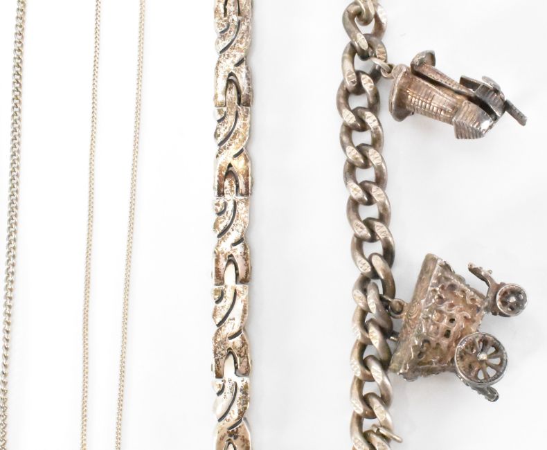 A collection of silver jewellery to include a  silver charm bracelet hallmarked for Birmingham,a silver and enamelled leaf brooch marked Norway, a pair of Niello work cufflinks, an engraved crucifix pendant silver chain and pendant set with a black stone alongside a Mexican silver watch link bracelet. Mexican bracelet measures 20cm in length and charm bracelet measures 19cm in length. Total weight 122.5g.