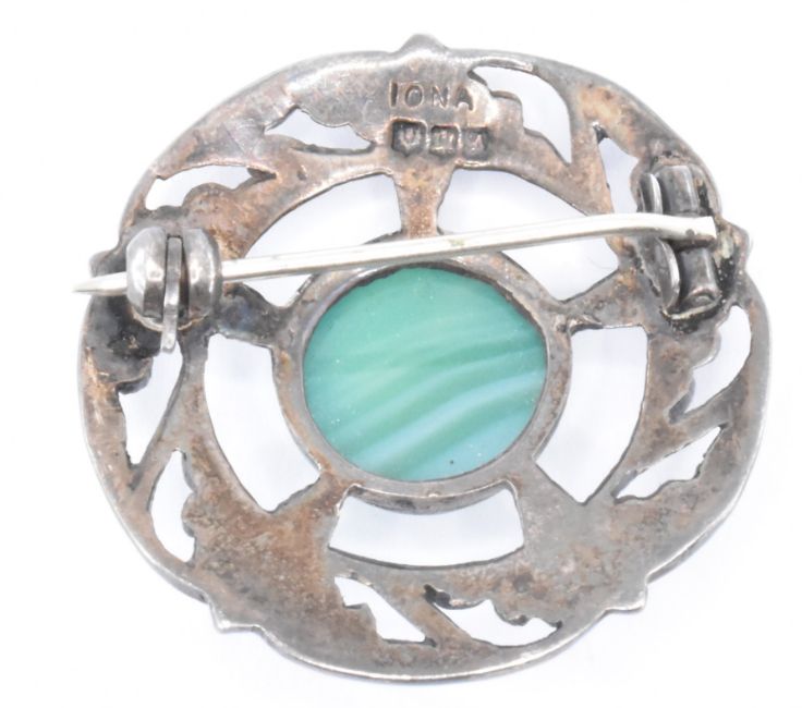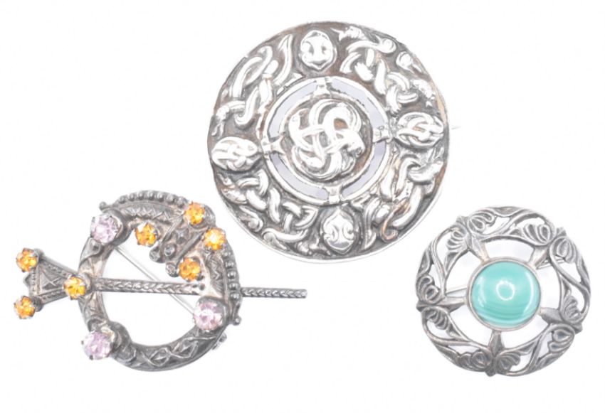 A group of Scottish silver brooches to include a silver hallmarked Iona brooch set with a green banded agate stone cabochon to the centre, a Ward Brothers Scottish silver brooch set with purple and orange stones and a moulded silver target brooch with pierced decoration. Iona brooch hallmarked Edinburgh (date letter rubbed), Ward brothers brooch marked sterling silver, rubbed marks to the back of the target brooch. Measures 3cm, 5cm and 4.3cm. Weight 38.0g.