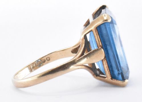 A hallmarked 9ct gold and synthetic spinel dress ring. The ring being set with an emerald cut blue synthetic spinel. Hallmarked London 1967. Weight 4.9g. Size M.5. Stone measures 16mm x 12mm x 6.7mm.