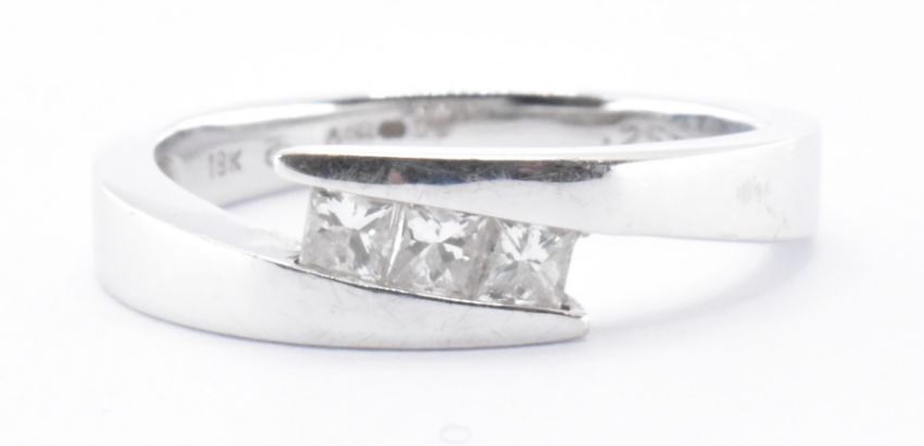 An 18ct white gold and diamond wrap around ring being set with three square cut diamonds. Assay marked London, sponsors marks S.G. Band marked 0.25 dia. Weight 3.2g. Size M.