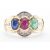 A 14ct gold sapphire, ruby, emerald and diamond ring. The tutti fruitti ring set with three oval cabochons to the centre with diamond accent stones set to the head and shoulders. Marked 14k. Weight 5.3g. Size O. Emerald measures 5.9 x 4.3 x 3.4mm, ruby measures 5.7 x 3.7 x 2.6mm, sapphire measures 5.3 x 4.1x 2.7mm.