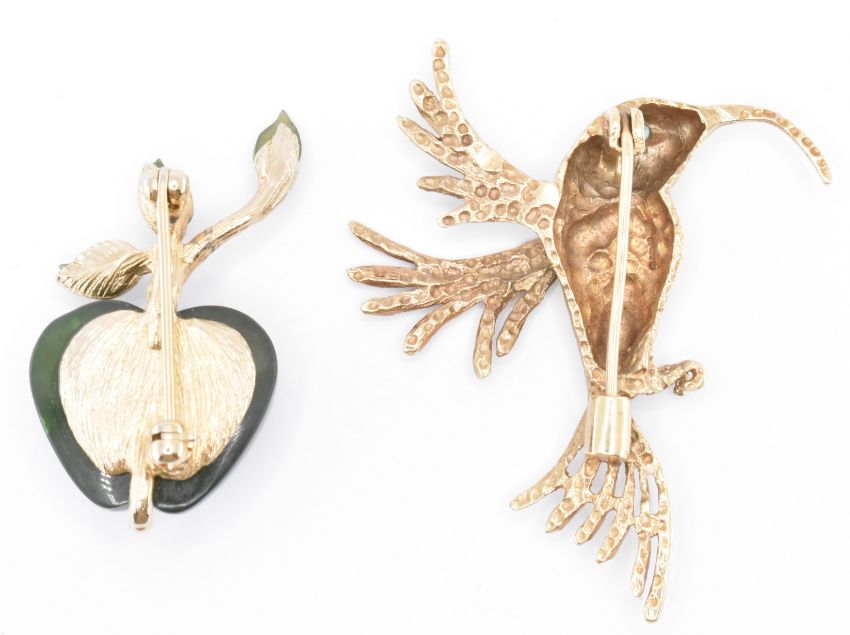 A hallmarked 9ct gold brooch in the form of a hummingbird having a green stone set to the eye (hallmarked Birmingham 1988, measures 4cm, weight 6.0g). Together with a green hard stone brooch in the form of an apple (measures 3.5cm, unmarked).