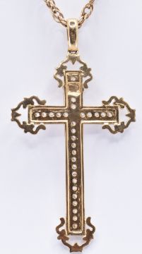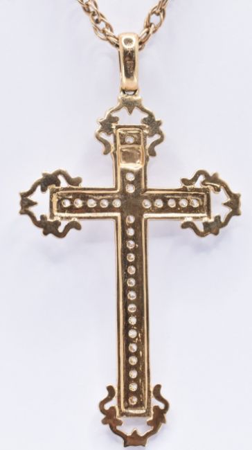 A 9ct gold crucifix pendant necklace having a twisted link chain with a large crucifix pendant set with white stones. Chain marked 375, pendant marked 375 to the bale. Chain measures 24 inches. Pendant measures 6cm. Weight 13.4g. Good condition.