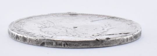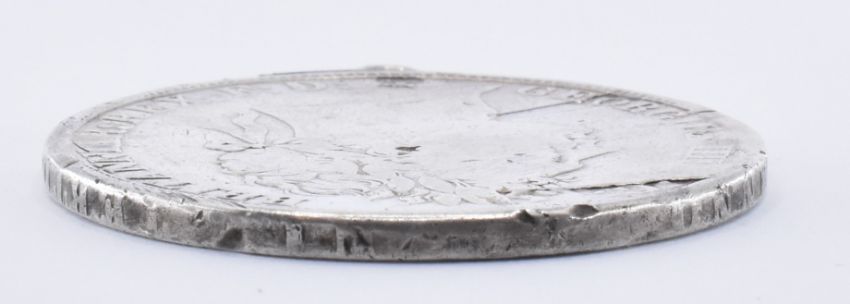 An 1822 George III silver crown coin having later Victorian coloured enamelling to the George and the Dragon design. Soldered bale to the top. Measures 3.8cm wide. Weight 24.7g.