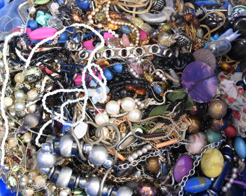 A large collection of vintage costume jewellery to include beaded necklaces, gold tone chain necklaces, bracelets, watch parts, bangles, rings, earrings, wrist watches, and brooches.