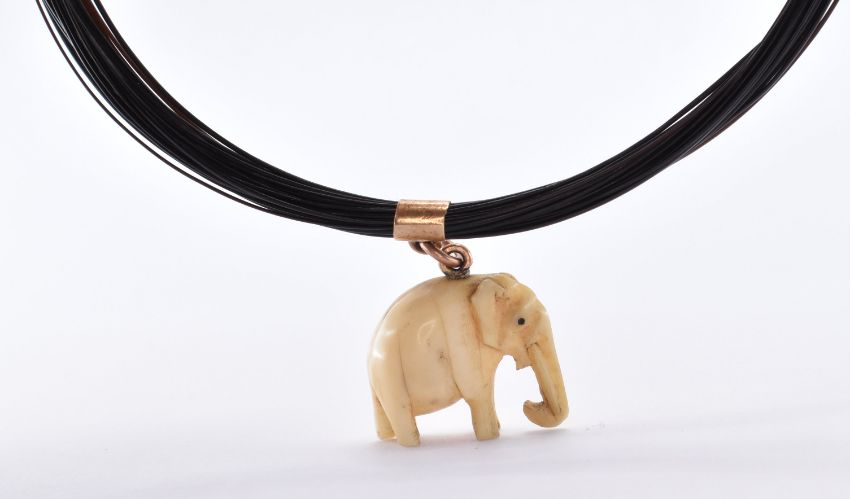 A 19th Century Victorian elephant hair bangle bracelet having gold ball terminals with a shield crest and carved ivory elephant charm. Gold unmarked but tests indicate high carat gold. Circumference 21.5cm maximum. Weight 6.5g. Good condition.