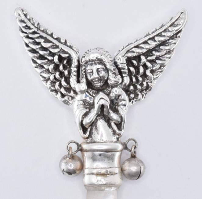 A silver babies rattle. The rattle having a faux mother of pearl handle with an angel figure the top. Marked sterling to the verso. Measures 9cm in length. Total weight 12.91g.