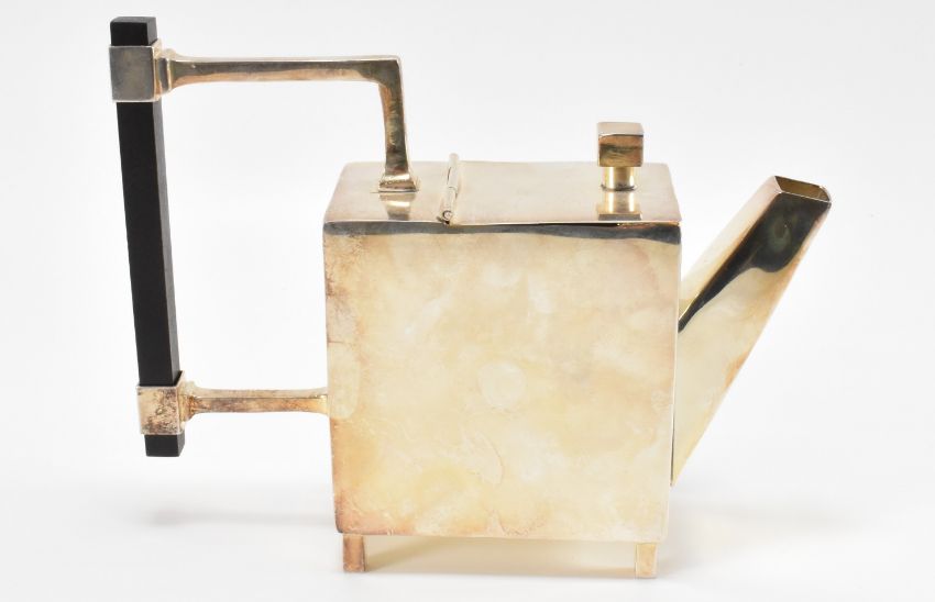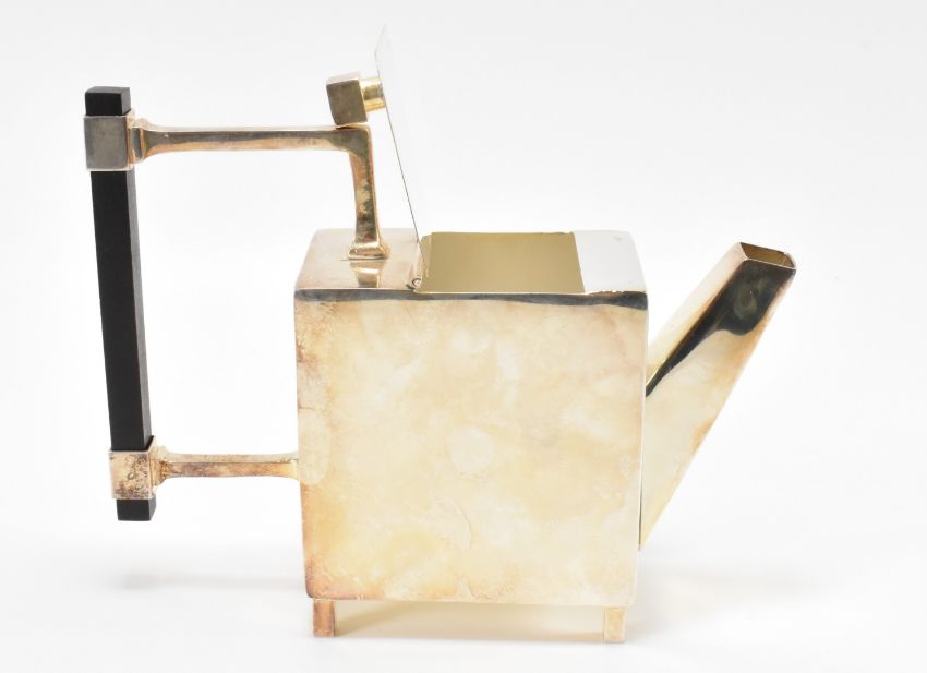 A silver plated teapot in the manner of Christopher dresser. The teapot having an ebonised wooden handle and an angular spout. Measures 16cm x 20cm x 6cm.