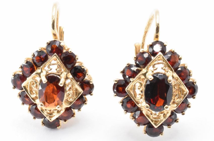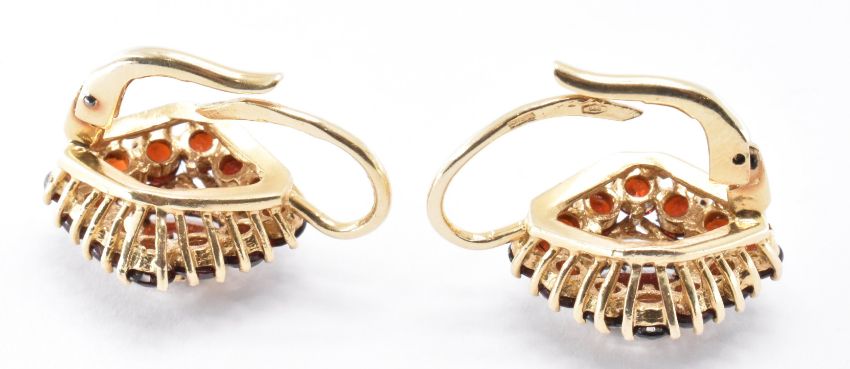 A pair of 14ct gold and garnet earrings. the heads of diamond shape being set with an oval cut garnet to the centre and a halo of round cut garnets surrounding it. Marked 585 to the posts. Weight 8.3g. Heads measure 1.8cm high.