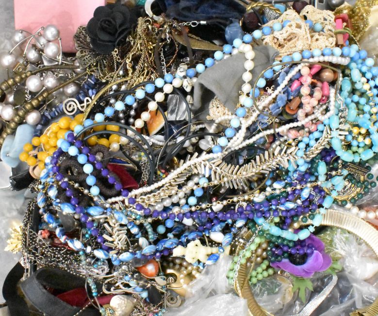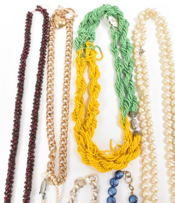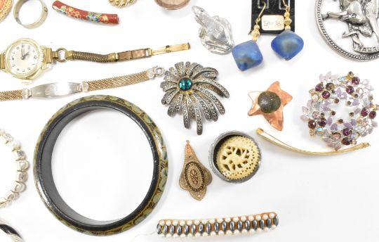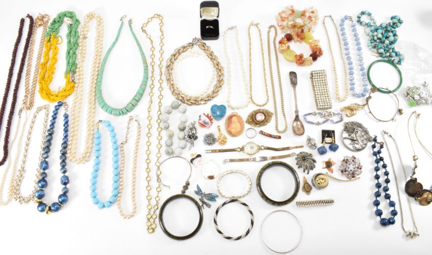 A large collection of vintage costume jewellery to include necklaces, bangles, mid Century brooches, a selection of loose beads and findings, clip on earrings, simulated pearls, bracelets, wrist watches and a silver white metal Taurus pendant.