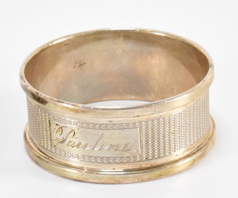 Three 20th Century silver napkin rings to include an engine turned example (hallmarked Birmingham 1957,Henry Griffith & Sons, 4.2cm), a canted rectangular example (hallmarked Birmingham 1931, John Rose, 4.9cm) and a rectangular example (hallmarked Birmingham 1956, Harman Brothers, 5.3cm). Together with two childs silver bangle bracelets (one hallmarked 1958, other unmarked, one measures 4.6cm and 5.5cm). Weight 75.5g.