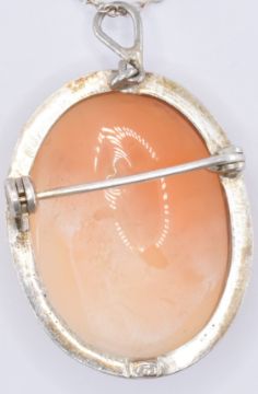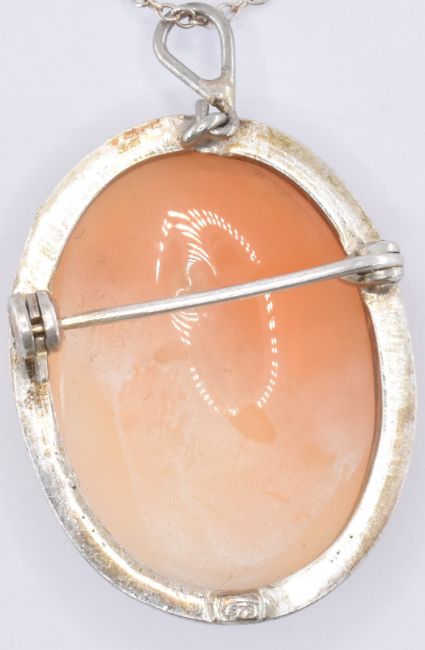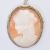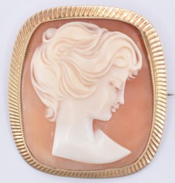 Two carved conch shell cameo brooches. One of square form being set within a 9ct gold mount (hallmarked Birmingham 1992, measures 3.7cm), the other of oval form set within a silver mount (marked 925, measures 2.8cm). Weight 13.5g.