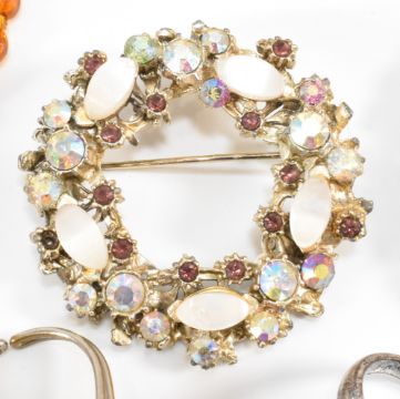 A collection of vintage costume jewellery to include a selection of clip on earrings, bracelets, bangles, rings, a mother of pearl carved cameo pendant, coloured stone set brooches and pendants.