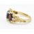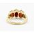 A hallmarked 9ct gold and garnet three stone ring. The ring having three oval cut garnets set within a pierced and scrolled mount. Central stone measures 7mm x 6mm. Hallmarked London. Weight 3.9g . Size L.5