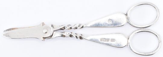 A pair of 19th Century Victorian Atkin Brothers silver hallmarked grape scissors having floral engraved handles with twisted details. Hallmarked Sheffield 1899. Weight 80.4g. Measures 15cm.