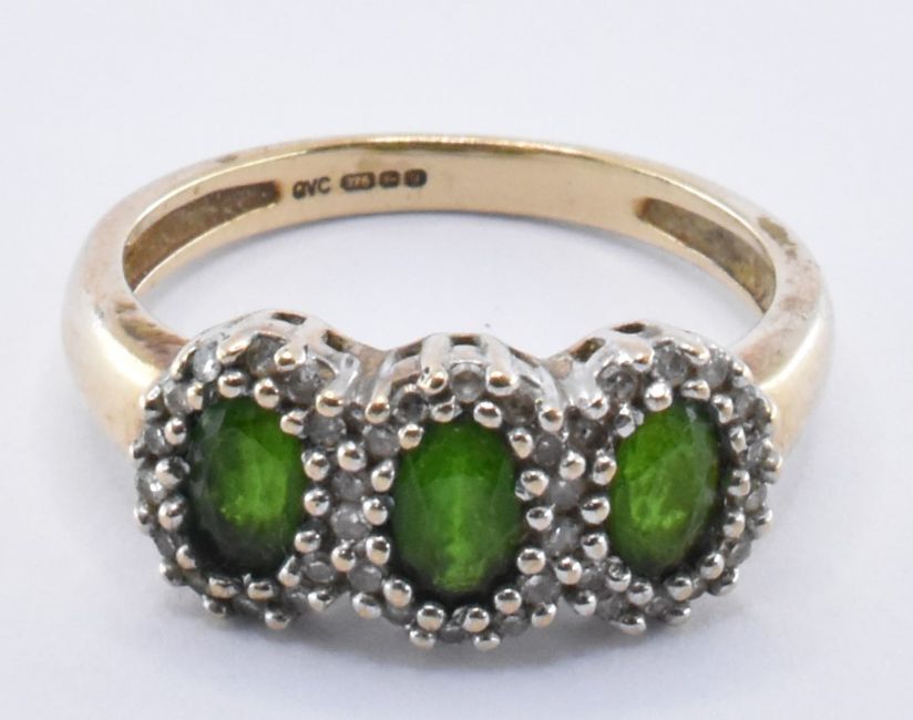 A hallmarked 9ct gold ring being set with three oval cut tourmalines each having a halo of round cut diamonds. Hallmarked Birmingham 2006. Principle stone measures approximately 5mm x 3mm. Weight 2.6g. Size L.