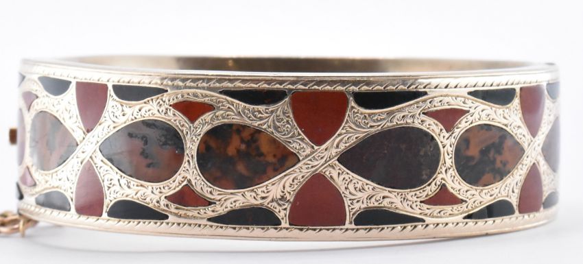 A 19th Century Victorian Scottish 9ct gold bangle bracelet being set throughout with coloured agate specimen stones with engraved detailing. The bracelet have a hinged opening with tongue in groove clasp and safety chain. Interior circumference 15cm. Weight 41.0g. Tests indicate 9ct gold.