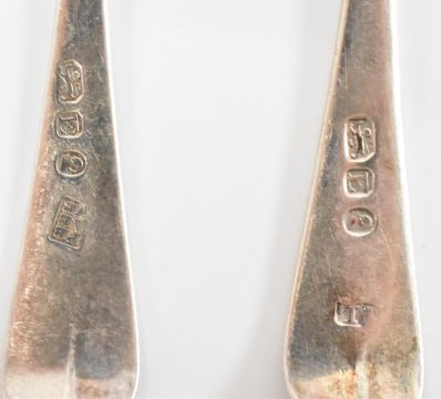 A set of six silver hallmarked teaspoons. Hallmarked London, various sponsors marks to include HS, RC, PB AB EB and illegible, date letters various but largely early 19th century George III. Measures 13cm in length. Total weight 73.40g.