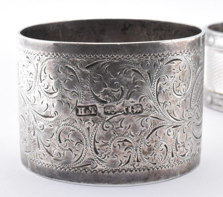 An assortment of silver napkin rings to include an arts and crafts style napkin rings with hammered borders (hallmarked Birmingham, makers marks for John Rose, measures 4.2cm wide), a foliate engraved napkin ring with initial panel to the centre (hallmarked Birmingham 1897, measures 4.7cm wide), an engine turned napkin ring with engraved initial panel (hallmarked Sheffield 1945, makers marks for JEB) and a napkin ring with gadrooned borders engraved with the name Alice (hallmarked Birmingham 1959, Joseph Gloster Ltd). Total weight 138.6g.