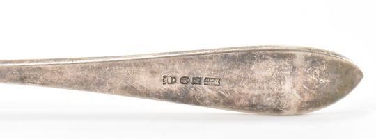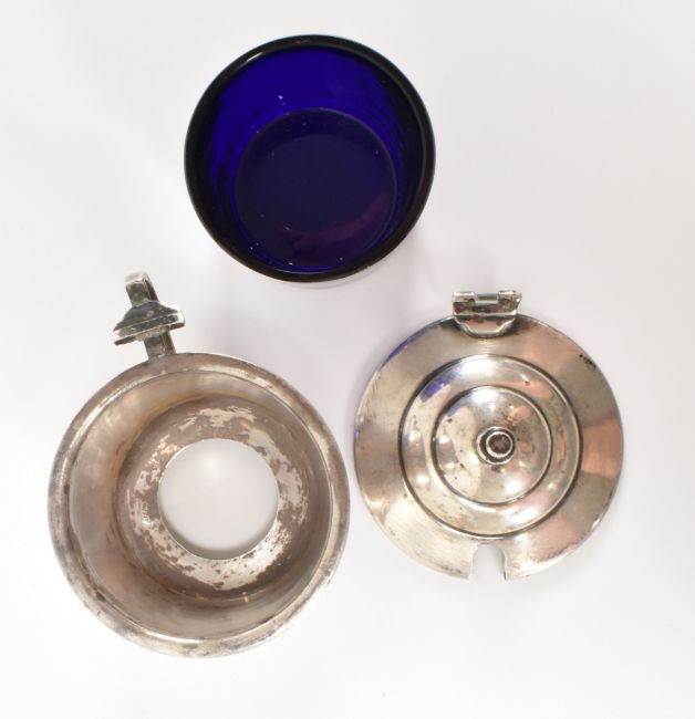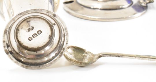 A 1930's Art Deco period silver hallmarked cruet set comprising of table salt with spoon (spoon silver plated), lidded mustard pot and pepperette cruet set. Hallmarked Birmingham 1936,makers marks for Deakin & Francis . Mustard pot lid AF. Weight 109g. Tallest measures 7cm.