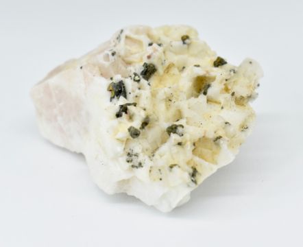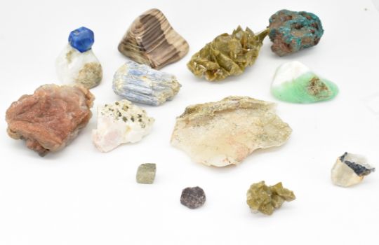 MINERAL SPECIMENS. A collection of mineral  and crystal specimens to include Kyanite, Dioptase, Ankerite, Calcite, Druzy Chalcedony, Pyrite, Tourmaline in Quartz, Boryte on Pyrrhotite, Polished lazurite on Quartz, Petrified wood. Smallest 2cm. Largest  8cm