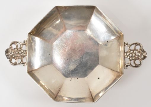 A hallmarked silver 1930's Jay, Richard Attenborough Co silver taste vin / octagonal serving dish. The Art Deco era serving dish having moulded berry handles and raised on a footed base. Weight 103.7g. Measures 15cm wide.