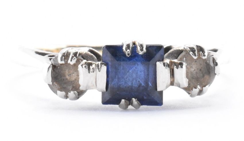 A 9ct gold synthetic sapphire and white stone ring. The ring marked 9ct to the shank with an emerald cut synthetic sapphire flanked by two white stones. Ring size N/ N.5. Total weight 1.85g.