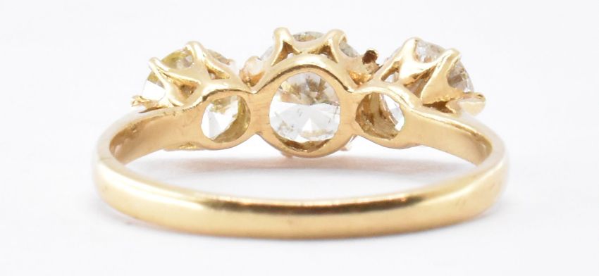 An 18ct gold three stone diamond ring.  The ring being prong set with three brilliant cut diamonds. Principle diamond measures 6.1 x 3.1mm. Secondary diamonds measure 5 x 3.0 and 5.2 x 3.3mm. Estimated 1.6ct in total. Marked 18ct. Weight 2.5g.