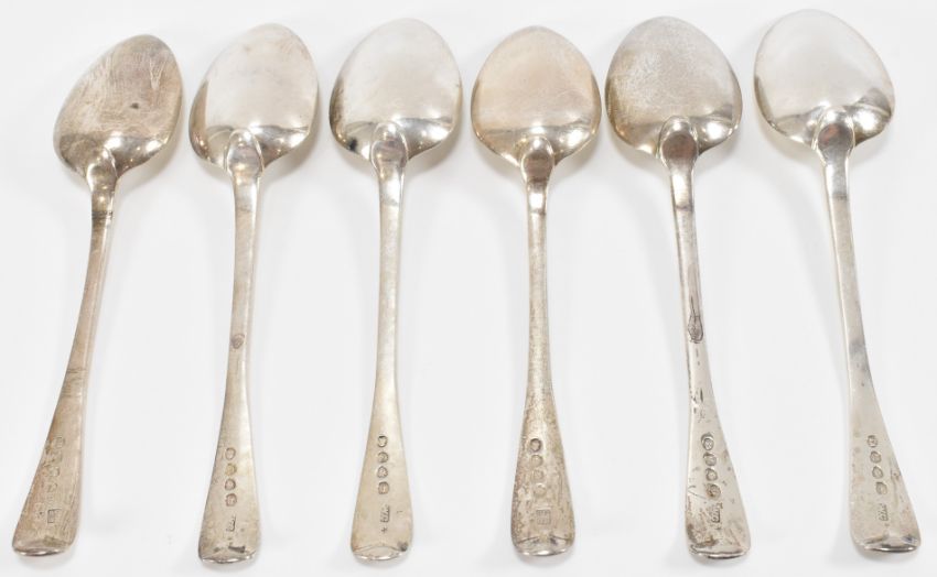 A silver hallmarked George IV set of six spoons. The spoons hallmarked for London, 1820. Sponsors mark for William Chawner. Total weight 215g approx. Measures 17cm.