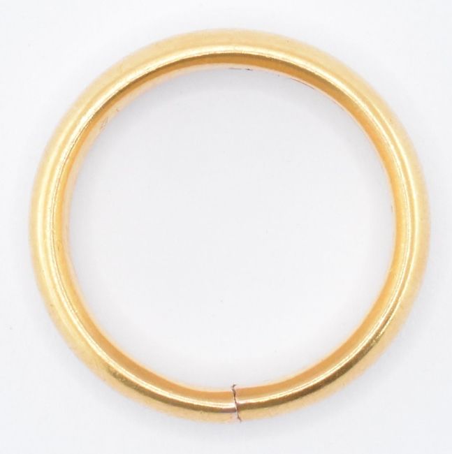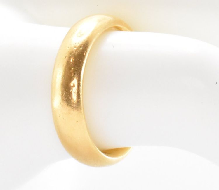 A hallmarked 22ct gold band ring. The ring being hallmarked for Chester, 1925. Ring size J. Band width 4mm. Total weight 6.85g.