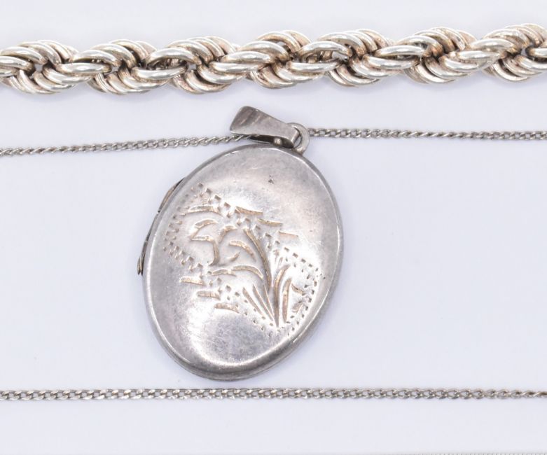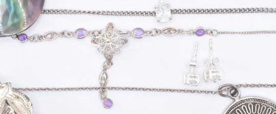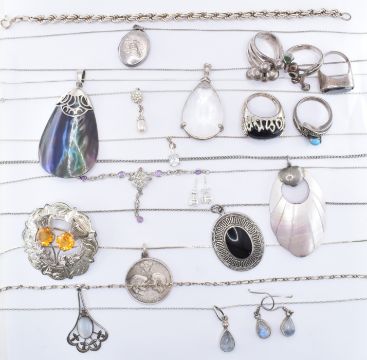 An assortment of silver jewellery to include a Scottish silver thistle brooch set with two orange stones (hallmarked Edinburgh 1962, Ward Brothers), a silver and labradorite pendant necklace and earrings suite, a moonstone set pendant necklace, a shell pendant, black stone pendant, rope twist bracelet and silver rings. Longest chain measures 22 inches, shortest measures 17 inches. Also includes some white metal. Total weight 132g.