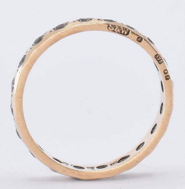 A hallmarked 9ct gold pendant in the form of a Holy Bible. The pendant opening to reveal the lords prayer in folded paper pages. Together with a hallmarked 9ct gold eternity ring set with white stone and being hallmarked for London 1979. Ring size L. Bible measures 14mm x 15mm x 4mm. Total weight 4.71g.
