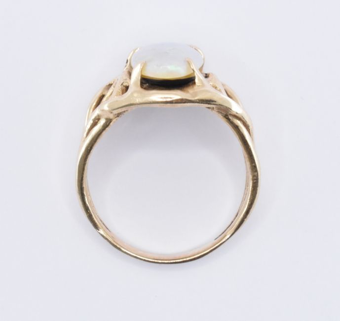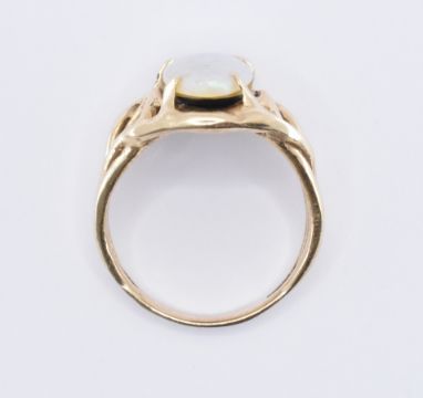 A 9ct gold and opal doublet ring. The ring with a central oval doublet opal within a pierced setting. Ring size Q. Total weight 7.29g. Unmarked but tests indicate 9ct gold.