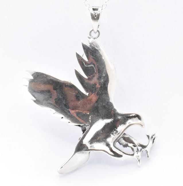 A sterling silver and marcasite pendant necklace. The pendant in the form of a American eagle on a fine link chain. Pendant and chain marked 925. Chain measures 17 inches. Pendant measures 6cm. Weight 14.3g.