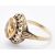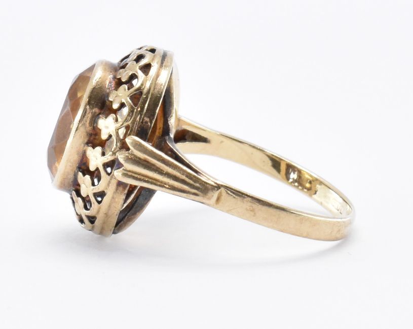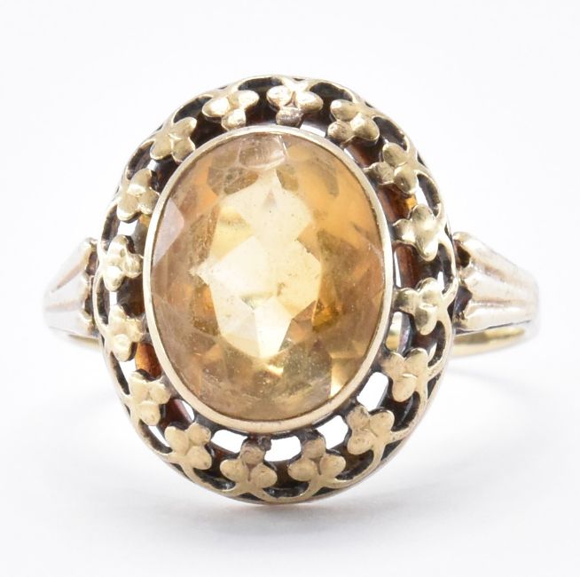 A 9ct gold ring being bezel set with an oval cut citrine in a pierced decorative mount. Import marked 375. Citrine measures 10 x 8.2 x 5.1mm. Weight 2.7g. Size L.5.