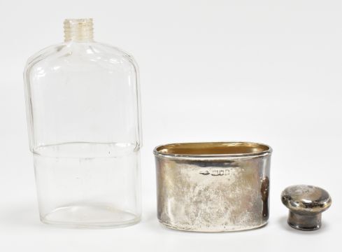 A mid 20th Century silver hallmarked hip flask retailed by Asprey. The cut glass bottle having faceted sides with a silver screw top and detachable silver stirrup cup to the base, engraved with initials. Cap hallmarked Birmingham 1940 Deakin & Francis, cup with rubbed London hallmarks, marked Asprey London to the base. Measures 15.5cm. Silver weight 67.7g.