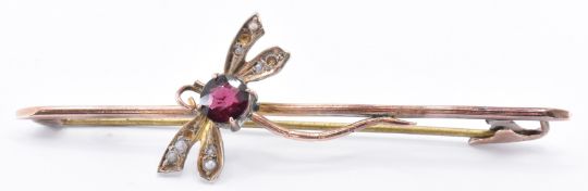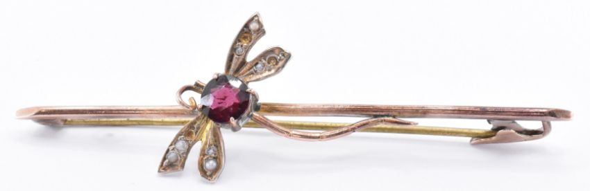 An early 20th Century Edwardian 9ct gold bar brooch having an applied dragon fly motif. The insect being set with a round cut red stone and seed pearls to the wings (some missing). Marked 9ct. Weight 3.0g. Measures 6cm wide. Antenna broken.