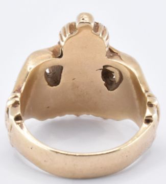 A hallmarked 9ct gold Claddagh ring having a heart clasped in hands to the head. Hallmarked Sheffield 1999. Weight 25.4g. Size Z.
