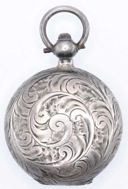 A 19th Century Victorian silver sovereign case of round form being engraved with scrolled foliates and having a round initial panel to the centre. The case opening to reveal a sprung sovereign holder to the inside and bale to the top. Hallmarked Chester 1899. Weight 16.4g. Measures 4.5cm. Makers marks rubbed.