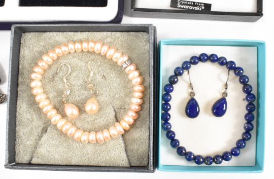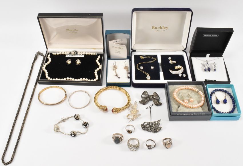 A group of contemporary jewellery to include a 9ct gold fine link necklace chain having a CZ set pendant (set in yellow metal, chain measures 16 inches, weight 2.1g), an earrings and necklace jewellery suite set with Swarovski crystals, a pair of silver fairy earrings set with purple stones, five silver rings (some being stone set, sizes P-T.5), two silver and marcasite set brooches, a cultured pearl earrings and bracelet suite, a silver white metal byzantine necklace chain (measures 26 inches), yellow metal bangle set with red stones. Approx silver weight 92.9g.
