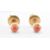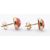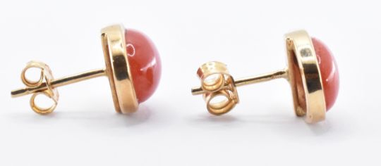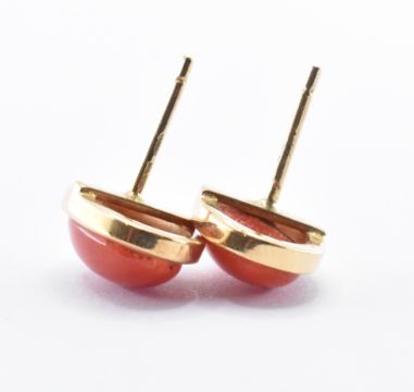 A pair of 18ct gold stud earrings set with red coloured glass cabochons (total weight 3.11g). Together with another pair of 9ct gold stud earrings set with coral cabochons. Largest cabochon measures 11mm x 7mm. Smaller measures approximately 3mm in diameter. (total weight 0.73g).