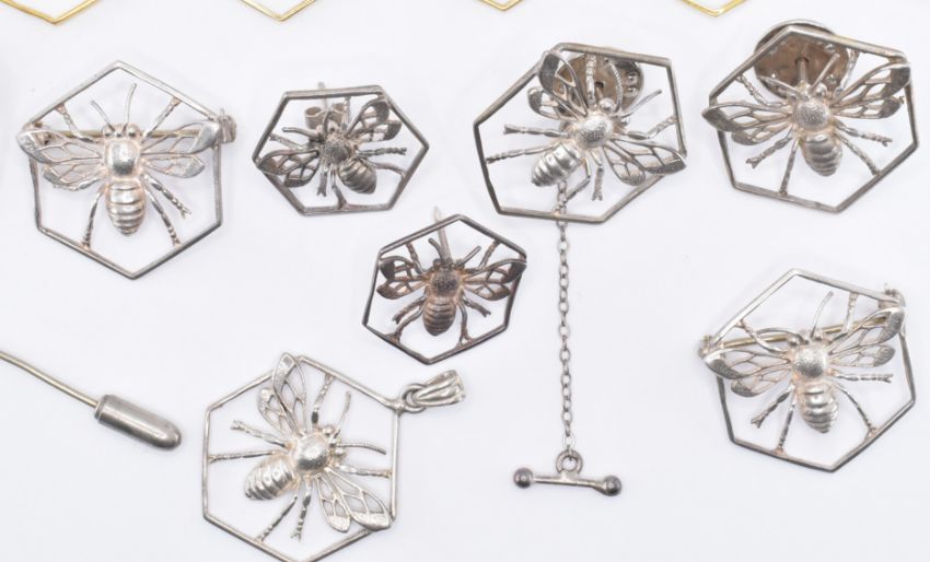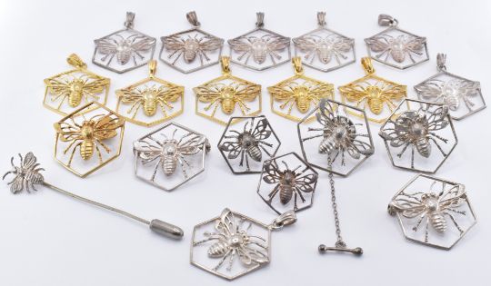 An assortment of yellow and white metal bee jewellery, each of hexagonal form with a bee figure to the centre. Lot to include brooch pins, pendants and a stick pin. Pendant measures 3.6cm, brooch measures 2.6cm wide.