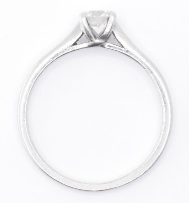 A hallmarked platinum and diamond single stone solitaire ring. Hallmarked Birmingham 2010. Diamond measures 4.4 x 2.9mm, diamond estimated 0.35ct. Weight 2.7g. Size J.5.