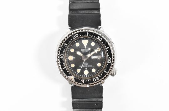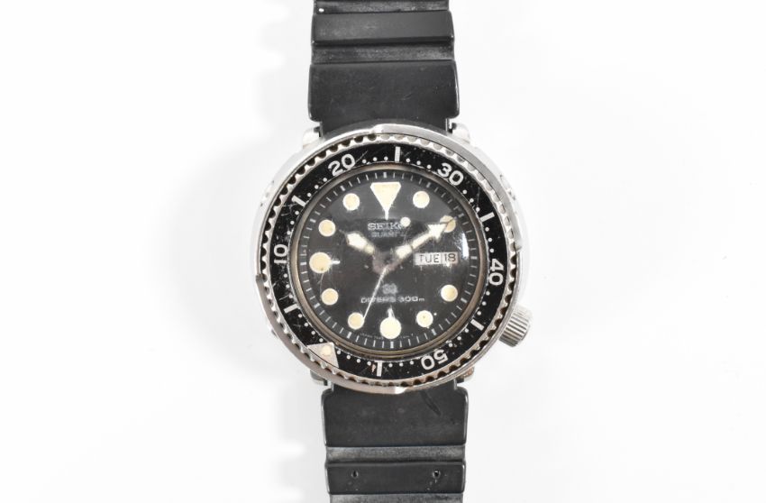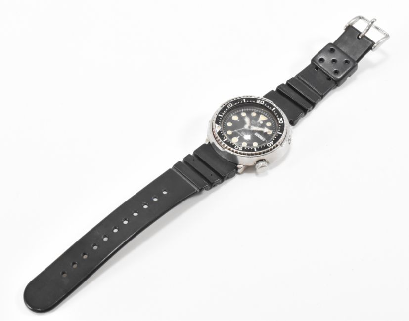 A Seiko quartz divers 300m wrist watch having a black face with round markers to the chapter ring, date aperture to three and a black enamelled bezel. The watch being mounted on a black rubber strap. Measures 4.3cm diameter from bezel. Hands wind nicely, but not ticking at time of cataloguing.