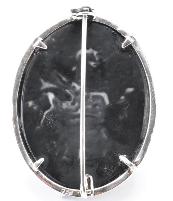 A silver cameo brooch having a central panel depicting a cat with raised detailing. Mount marked 925. Weight 6.8g. Measures 4cm tall.