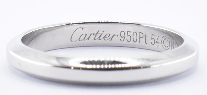 A Cartier platinum wedding band ring. Marked Cartier 950 Pt 7082, with French dog mark to interior of the band. Weight 4.9g. Size N. With red Must de Cartier box.